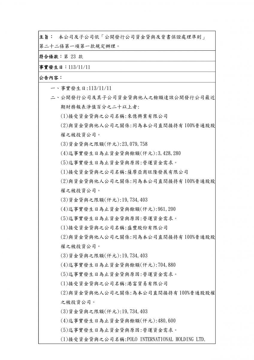 本公司及子公司依「公開發行公司資金貸與及背書保證處理準則」 第二十二條第一項第一款規定辦理