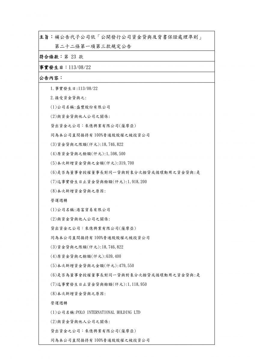 補公告代子公司依「公開發行公司資金貸與及背書保證處理準則」 第二十二條第一項第三款規定公告